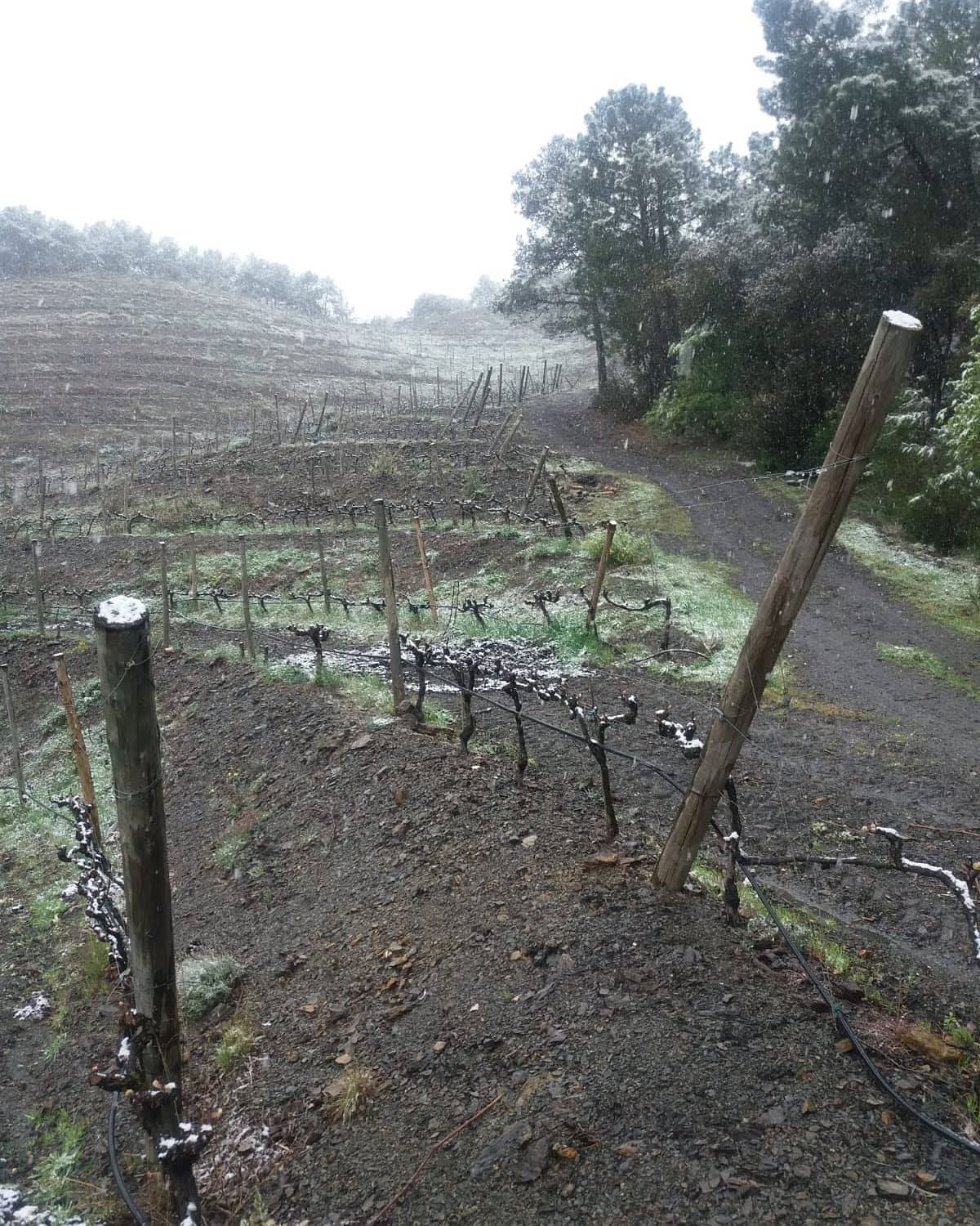 Yesterday’s snowfall left us with this image: the carignan wines of the Coster of ​​the Era were well whitewashed. Rainfall today continues
